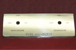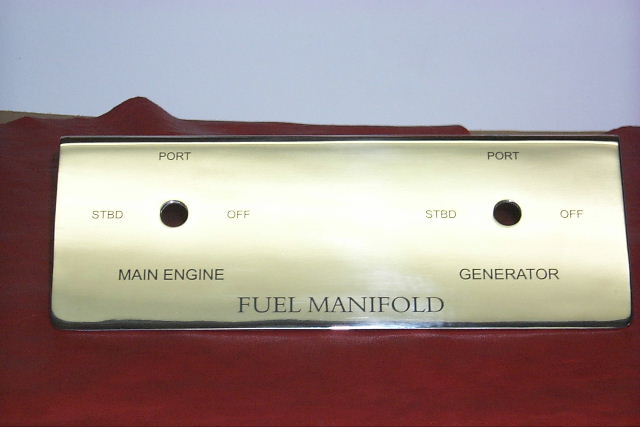 An engine room below decks aboard the sailing vessel HANNA and detailed by Brown Beezer sports a stainless steel manifold adorned with graphics as specified.